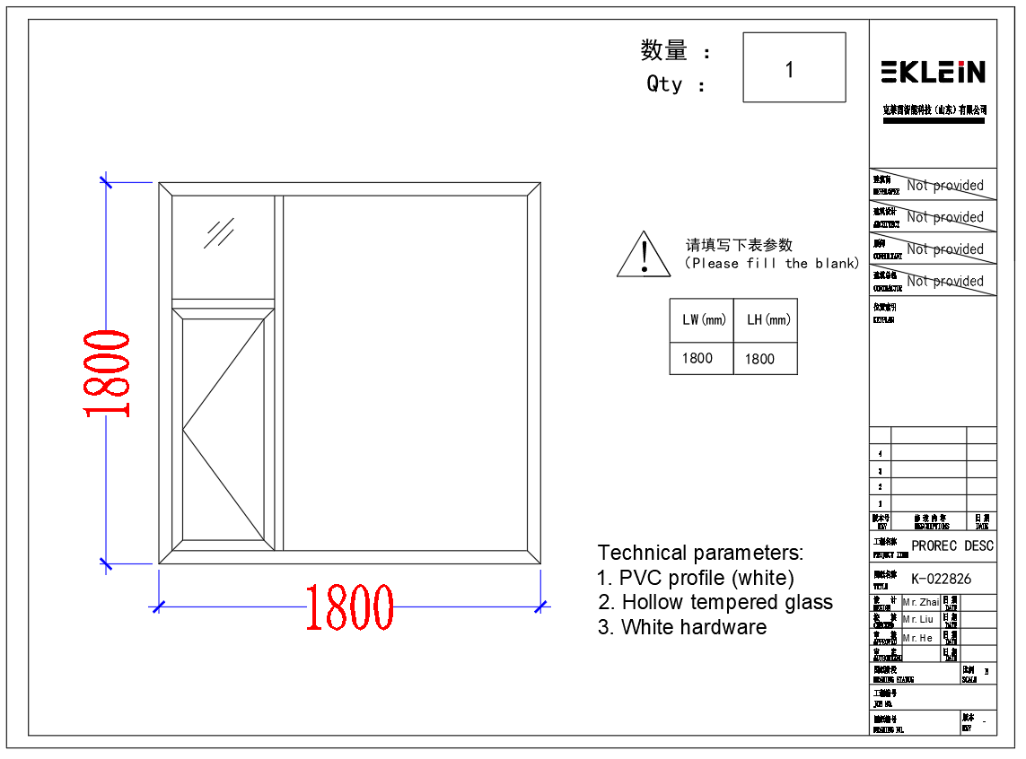 | Main parameters | Door Frame: UPVC frame, profile wall thickness 2.5mm; Glass: (Double-glazed tempered glass 6+9a+6mm LOW-E) |